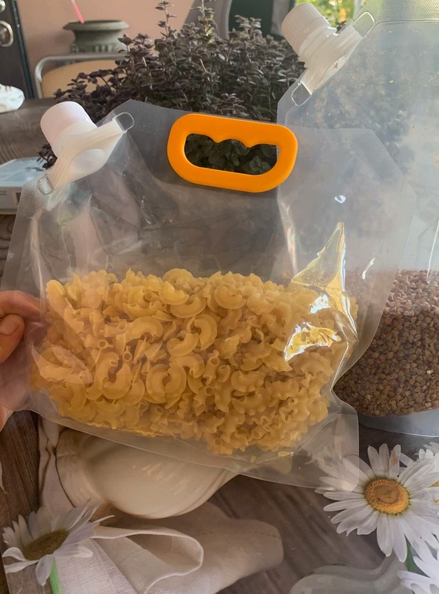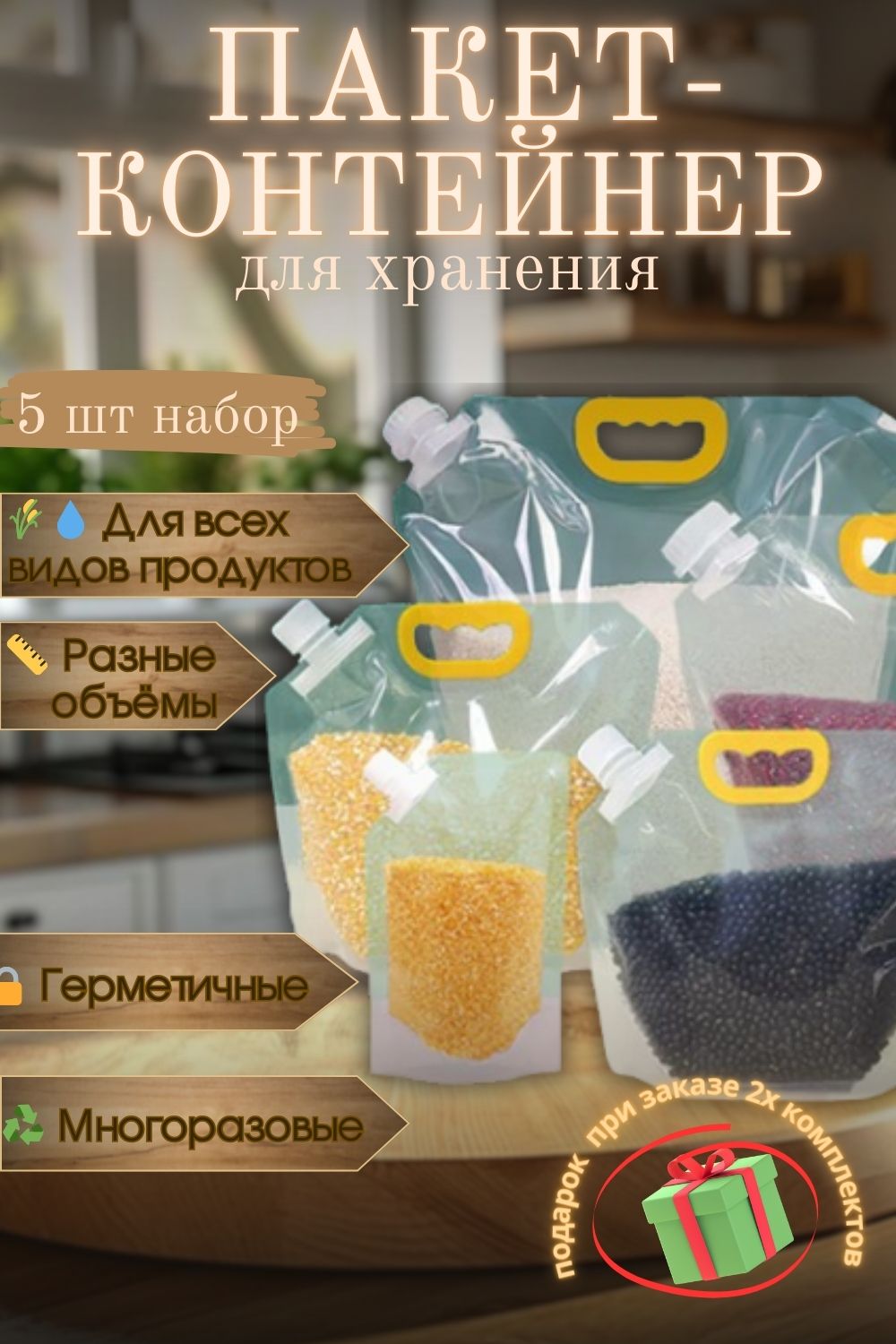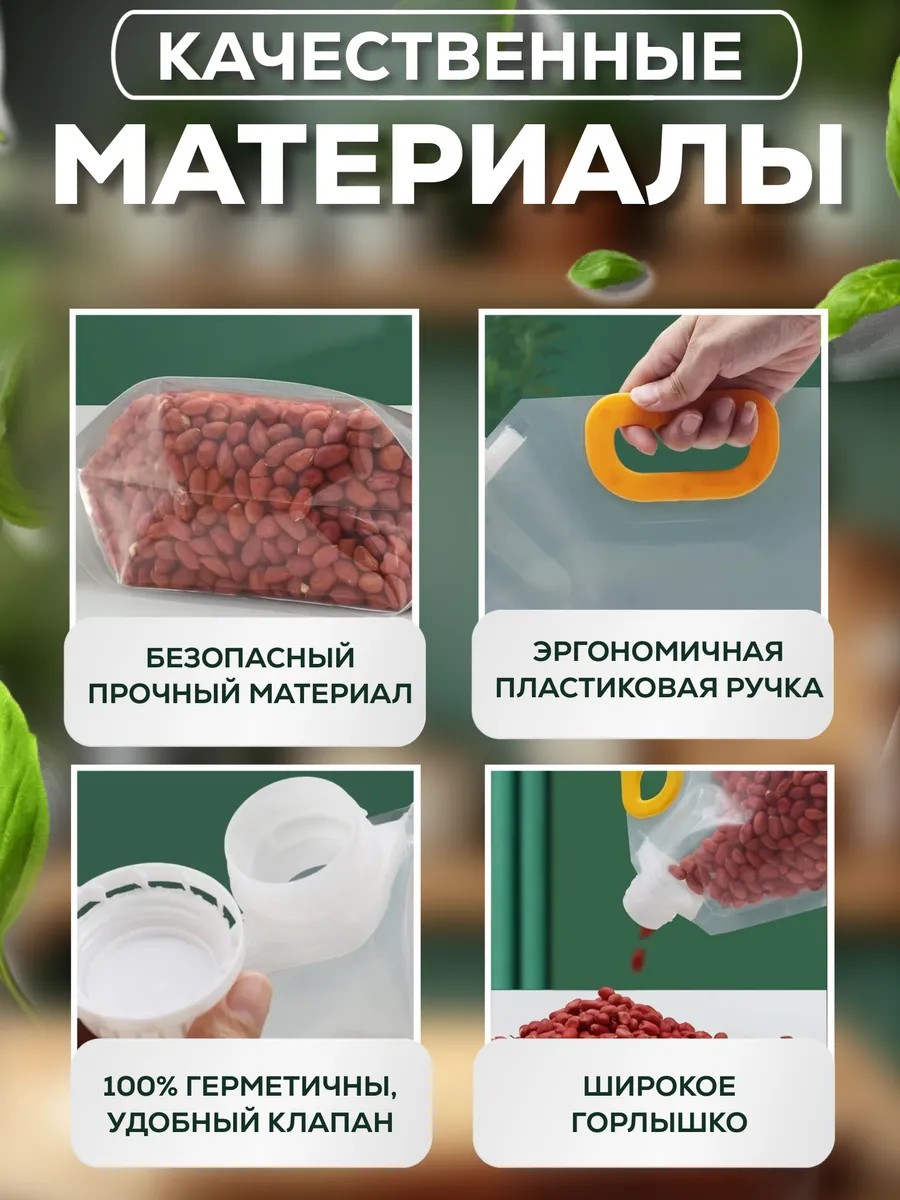Наши пакет-контейнеры сделаны из плотного и прочного пластика, который не рвётся и служит годами. Широкие удобные горлышки позволяют легко насыпать крупы, наливать жидкости и доставать продукты без рассыпания.